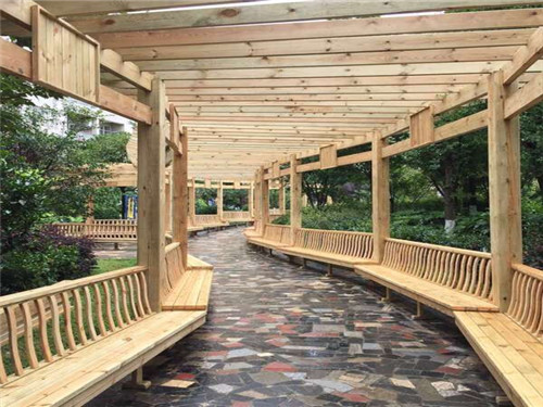 安裝環節需注重基礎穩固性。地面需平整硬化,若為軟土則需澆筑混凝土基座,立柱埋入深度不少于0.5米,并填充水泥加固。立柱間距應均勻,誤差不超過2厘米,橫梁與立柱連接處需使用不銹鋼螺栓或防腐木專用連接件,避免釘子易松動的問題。安裝后需檢查結構垂直度與水平度,用木楔調整偏差。最后,在木材表面涂刷兩遍戶外防腐木油,增強防潮、防裂性能,延長使用壽命。